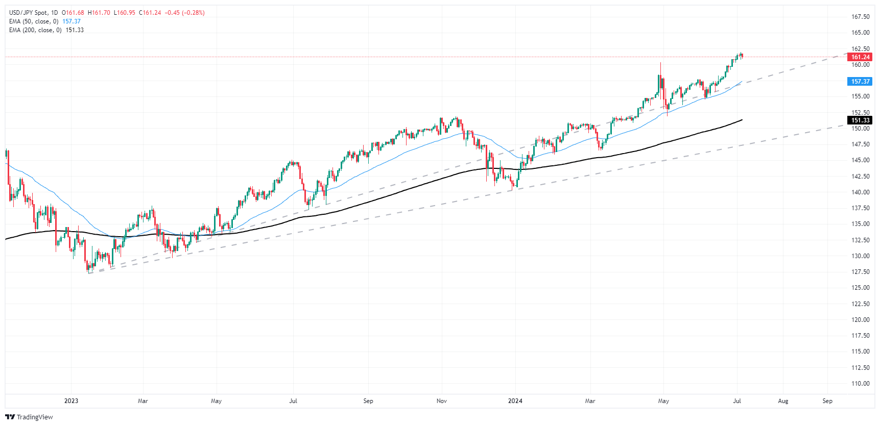 看涨势头已暂停,盘中出价略低于本周早些时候设定的40年峰值。除了162.00把手可能被买家视为目标而非墙外,几乎没有什么技术障碍存在。