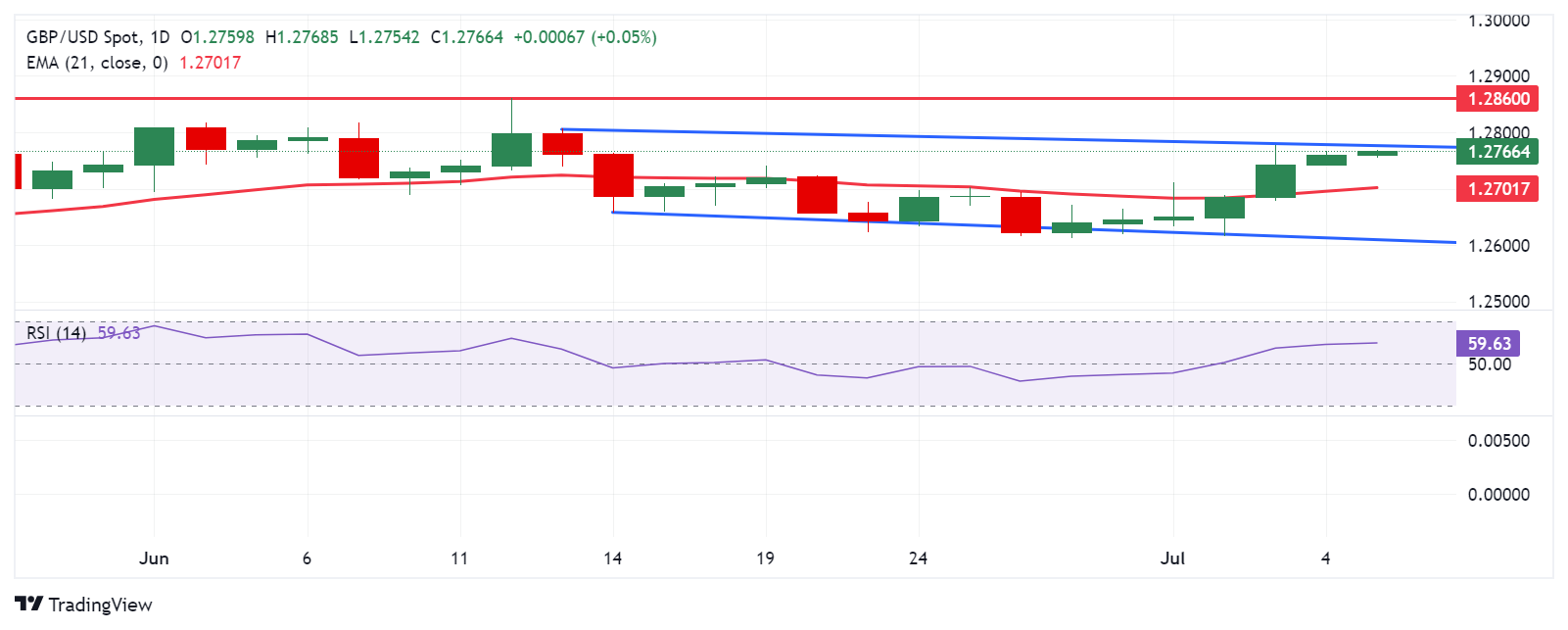 英镑/美元周五的交易价格约为1.2760。日线图的分析表明了看跌倾向,这对组合在一个下降通道内进行了整合。然而,14天相对强弱指数(RSI)高于50水平,这表明任何进一步的上涨都可能削弱看跌前景。