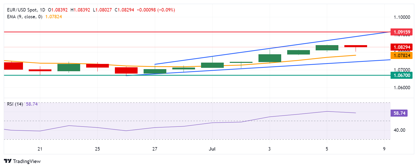 不利的方面是,欧元/美元的初始支持值接近于1.0782的9天指数移动平均值(EMA),其次是上升通道下边界1.0750的支持。