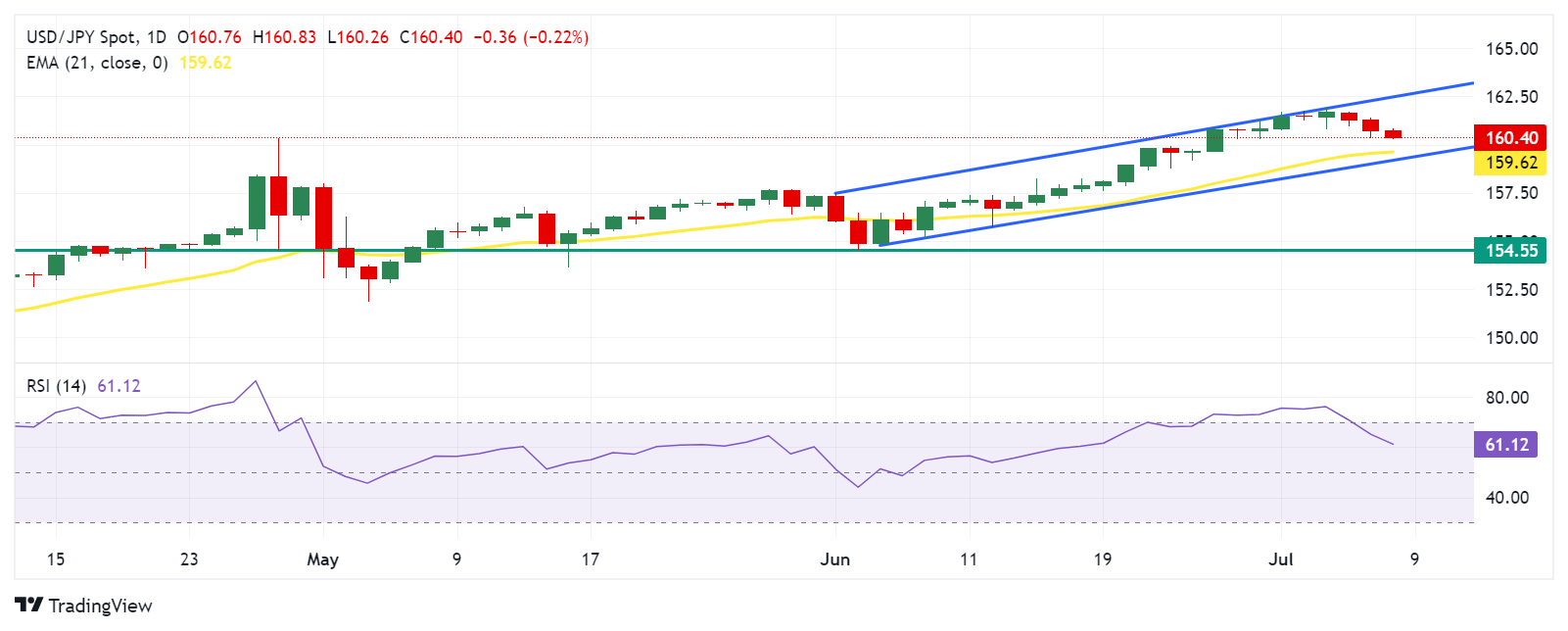 美元/日元周一在160.30附近交易,根据日图分析显示出看涨倾向。该对保持在上升通道模式内。然而,由于14天相对强弱指数(RSI)已降至70以下,这表明正在进行的上升趋势可能会减弱,因此需要谨慎。