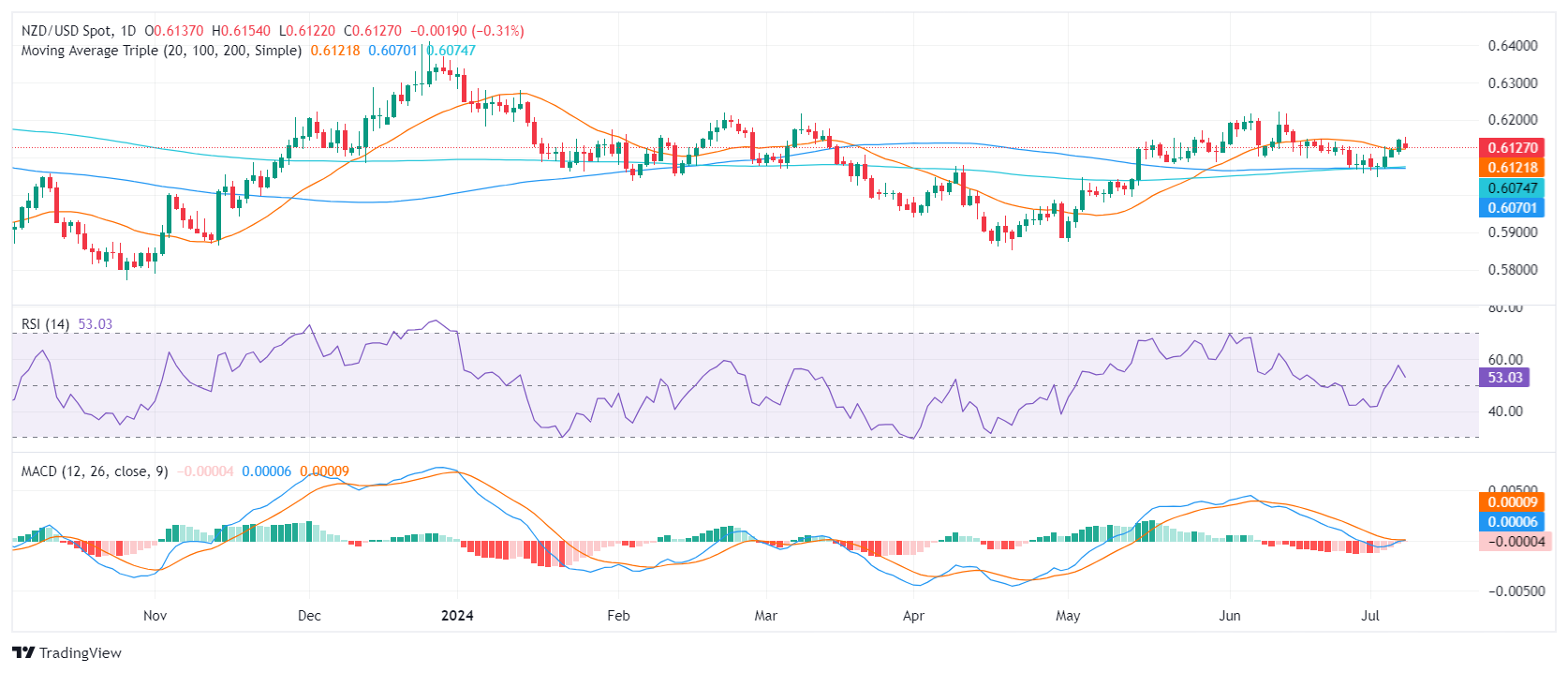 周一,新西兰元/美元表现不佳,下跌0.30%,报0.6125,抵消了其每日涨幅。尽管如此,这对组合还是成功地捍卫了其在20天简单移动平均线(SMA)支撑位0.6120上方的位置,这是在过去一周安全实现的壮举。