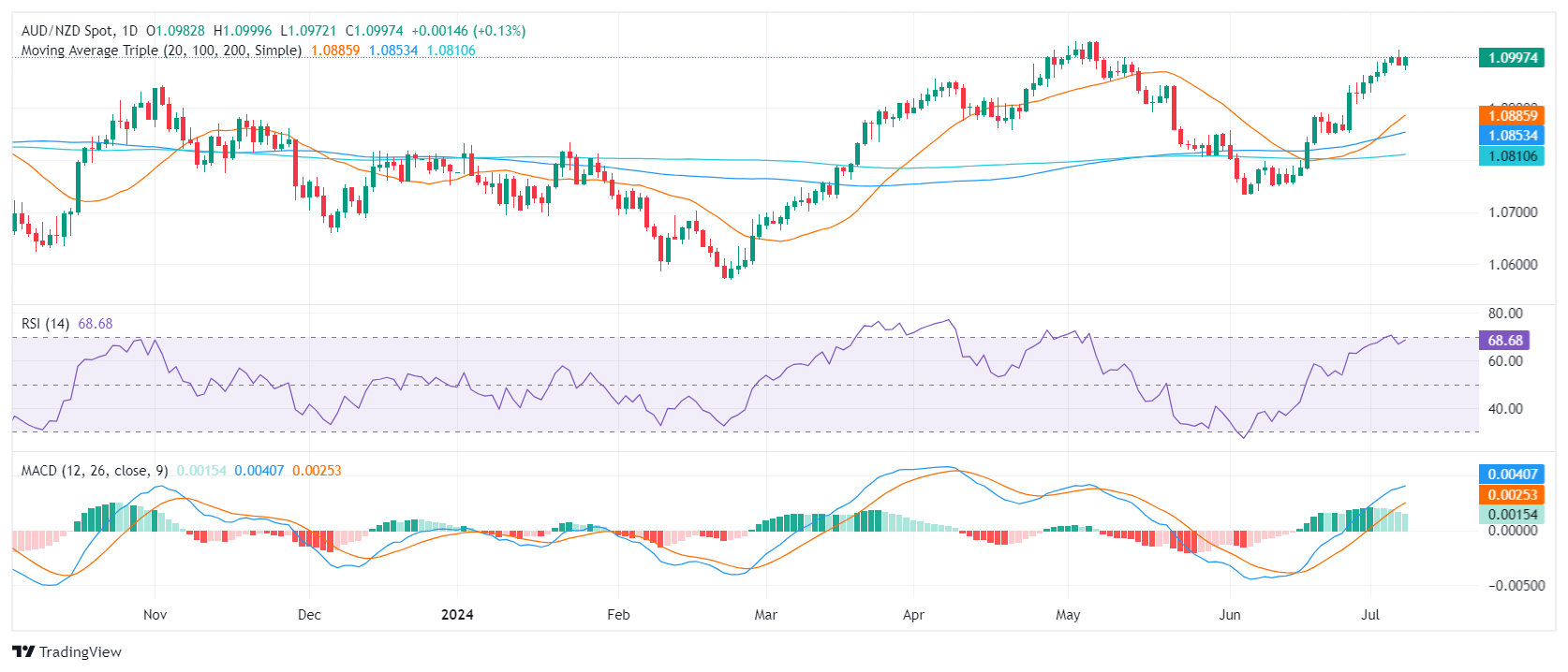 支撑水平分别为1.0950、1.0930和1.0900。买家将把1.1000作为下一个阻力目标。修正可能即将到来,但只要澳元/新西兰元保持在20日、100日和200日简单移动平均线(SMA)上方,前景仍然有利。