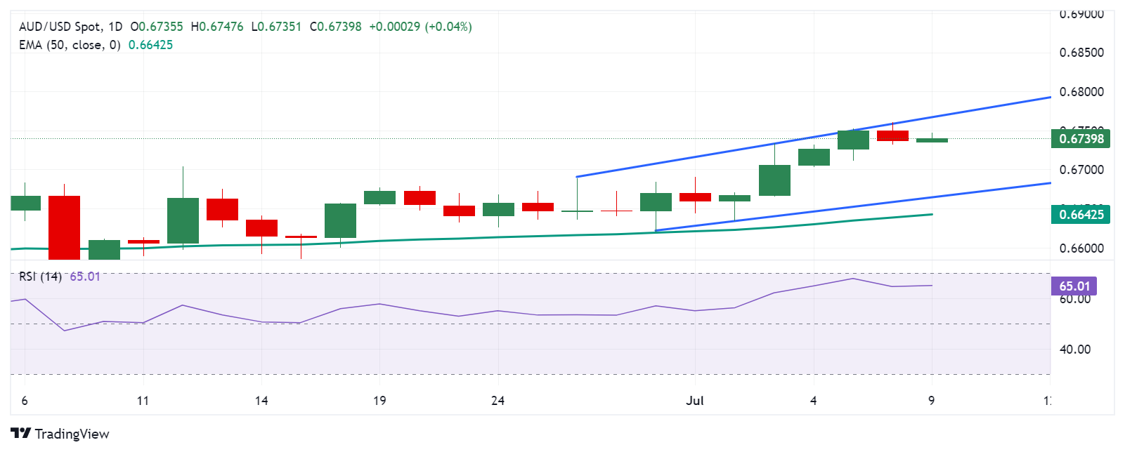 周二,澳元兑美元汇率约为0.6740。日图分析显示,澳元/美元对在上升通道内盘整,表明存在看涨倾向。此外,14天相对强弱指数(RSI)保持在50点以上,证实了牛市势头。