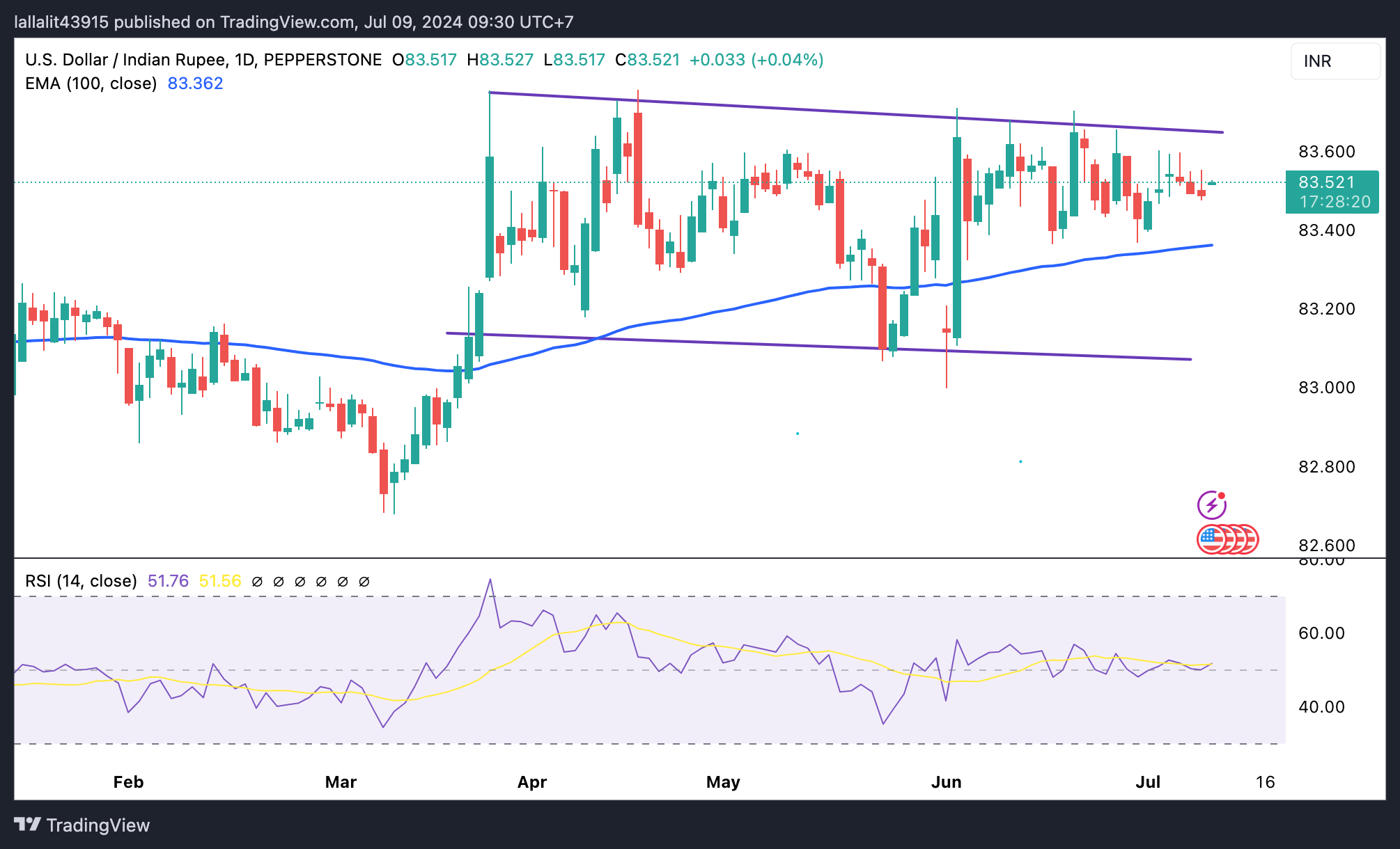 技术分析:美元/印度卢比近期进入盘整阶段,潜在阻力位83.65,初始支撑位83.35