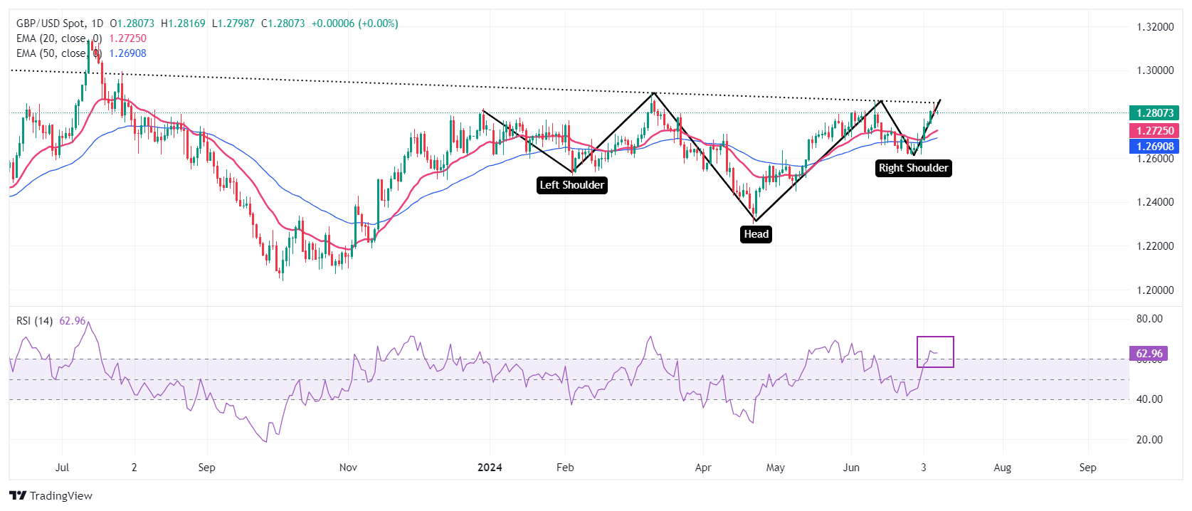 周二晚些时候的亚洲交易日,英镑接近1.2800上方的三周高点。英镑/美元在每日时间框架内形成一个倒置的头肩图(H&S)模式。领口绘制在1.2850附近。H&S形态的突破导致牛市反转。