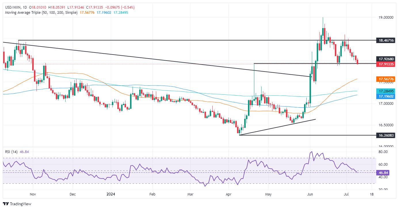 也就是说,如果美元兑墨西哥比索的日收盘价低于18.00,下一个支撑将是6月24日17.87的摆动低点。50天简单移动平均线(SMA)下方进一步下跌,为17.56点,其次是200天SMA,为17.26点。下一层将是17.17的100天SMA。