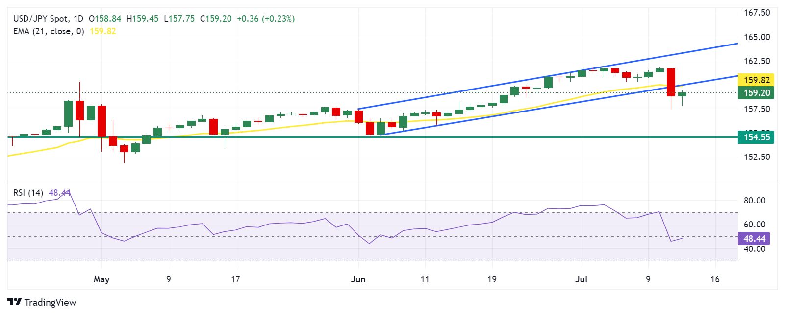 周五,美元/日元的交易价格约为159.30。日线图分析显示,看涨倾向减弱,因为它突破了上升通道模式的下限。此外,14天相对强弱指数(RSI)略低于50水平,表明该货币对价格的势头有所下降。