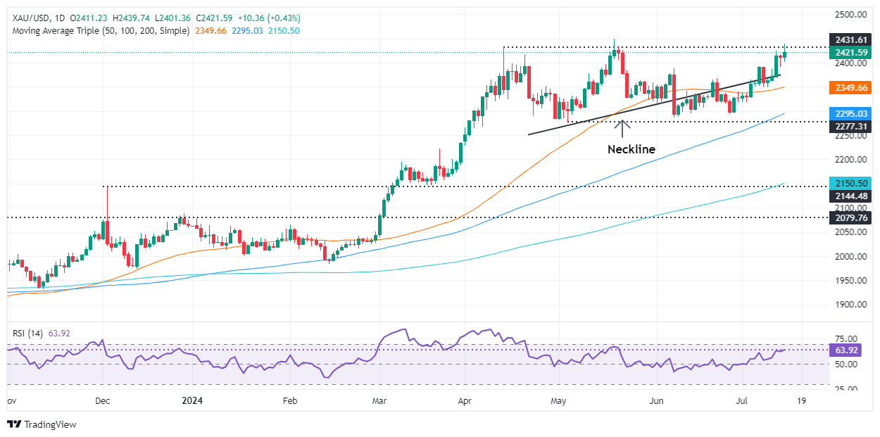 在特朗普周末遭到暗杀袭击后,周一黄金开盘小幅下跌,这增加了他赢得11月大选的机会。这提振了美元,尽管担忧消退,黄金/美元恢复了看涨趋势,将金价推高至2439美元的数周高点。