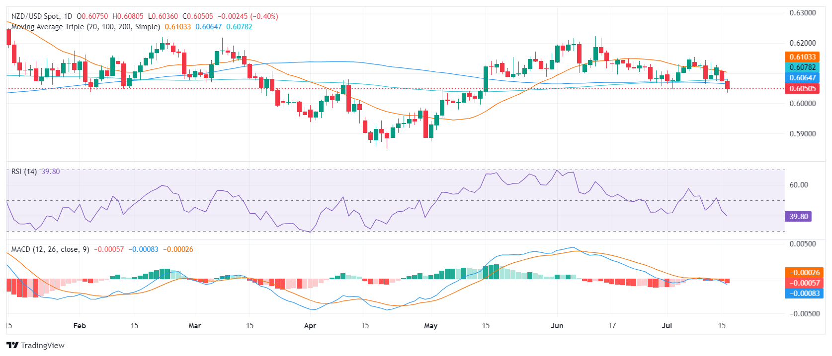 在周二的交易中,新西兰元/美元下跌0.40%,达到0.6052的水平。买家未能守住0.6070的关口,导致该货币对触及5月中旬的低点。值得注意的是,新西兰元/美元现在低于20、100和200天的重要简单移动平均线(SMA),表明前景看跌。