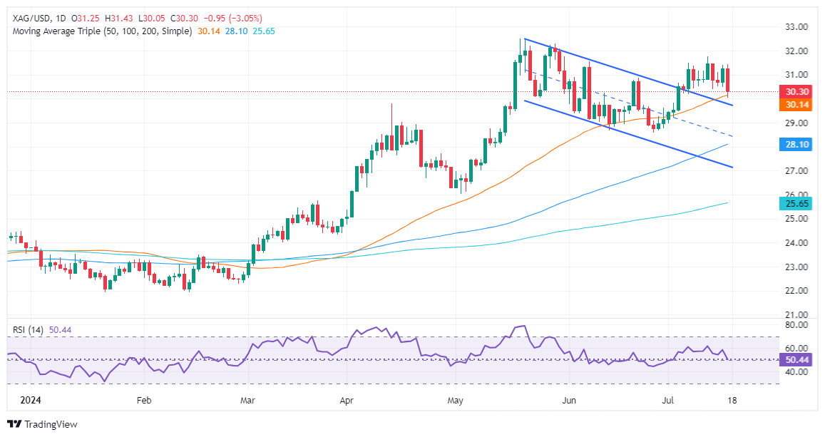 尽管下跌,但白银/美元仍保持向上趋势,50天移动平均线支撑在30.12美元。