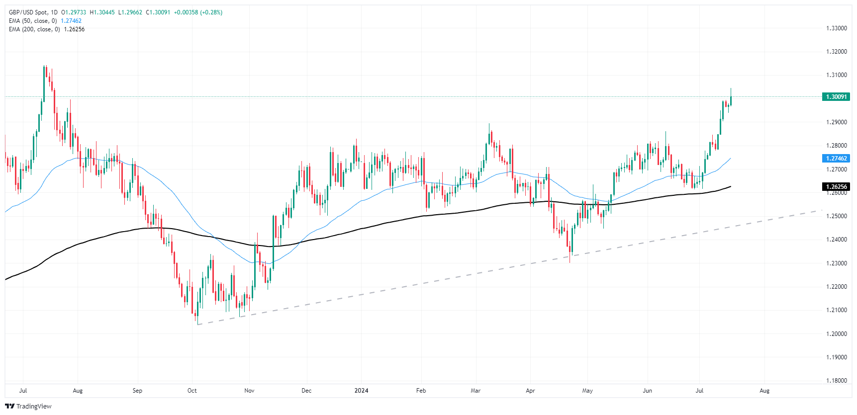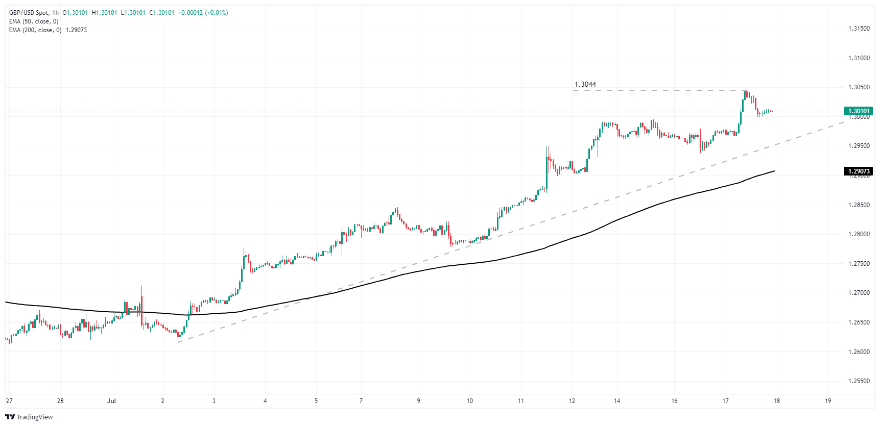 交易员已将英镑/美元推高至1.3000点以上的52周高点,看涨势头加速至高端,并将盘中价格走势进一步拉至200小时指数移动平均线(EMA)以上。如果缺乏持续的买入,英镑/美元将很容易从7月初略高于1.2600的底价回落到短期上涨趋势线。