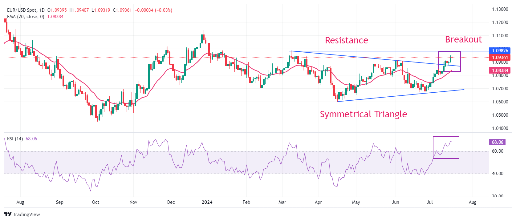 欧元/美元价格分析:在欧洲央行政策会议倒计时中盘整在1.0950左右,近期前景看涨