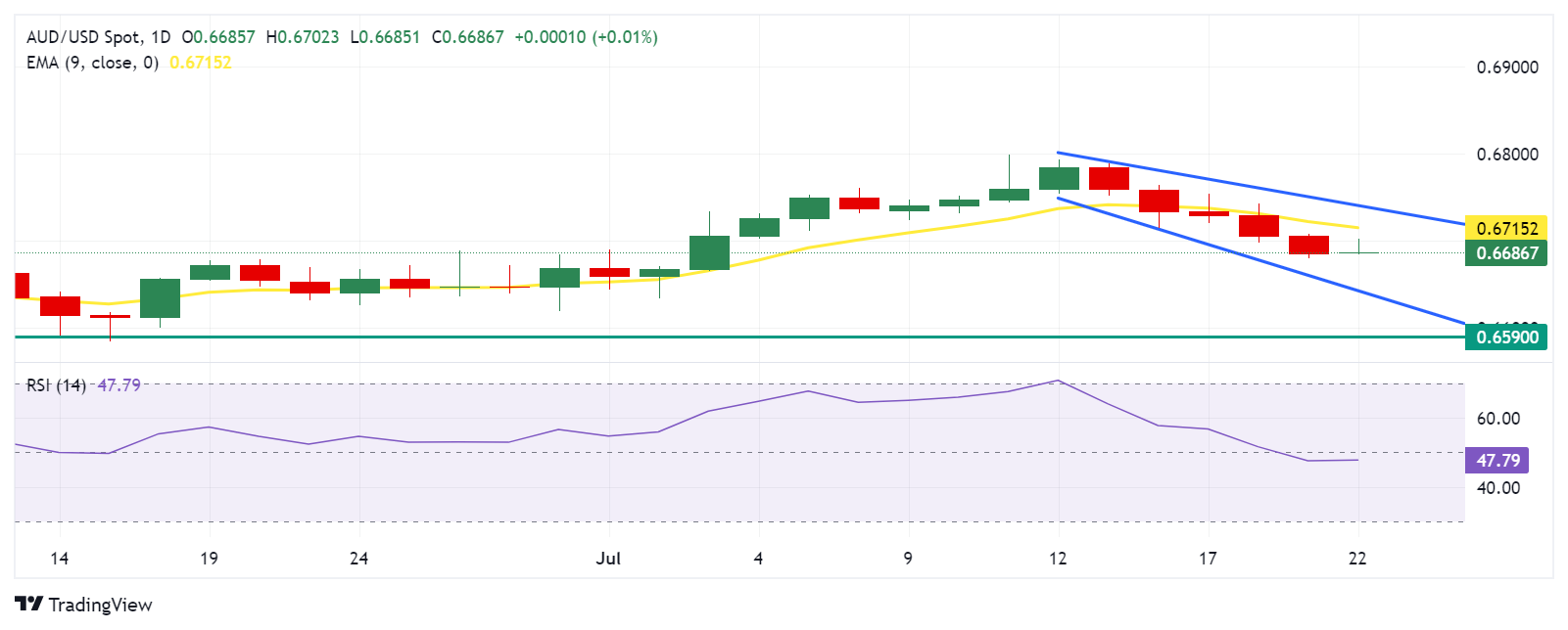 周一,澳元的交易价格约为0.6690。日线图分析显示,澳元/美元对在下降通道内贬值,表明看跌倾向。尽管14天相对强弱指数(RSI)略低于50,表明出现了看跌趋势。