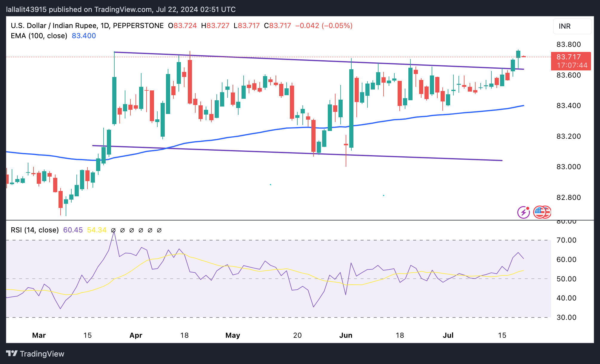 印度卢比当天交易走强。美元/印度卢比一直处于上升趋势,因为它已经证实突破了一个月的交易区间,同时保持在日线图上关键的100天指数移动平均线(EMA)之上。此外,上涨势头也得到了14天相对强弱指数(RSI)高于63.60点的支撑,这表明进一步的上涨可能即将到来。