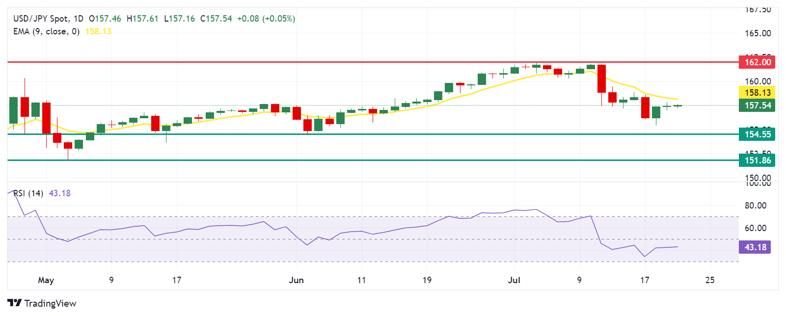 周一,美元/日元的交易价格约为157.60。日线图分析显示,该货币对低于158.14的九天指数移动平均线(EMA),表明短期下行势头。这表明,在考虑买入之前,要等待趋势逆转的迹象。此外,14天相对强弱指数(RSI)低于50,强化了看跌前景。