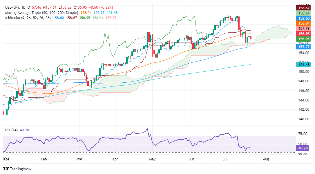 周一,美元/日元下跌超过0.20%,仍位于Ichimoku Cloud(Kumo)最窄部分的顶部附近,交易员们预计将进一步下跌。随着周二亚洲交易日的开始,该货币对的交易价格为156.96,几乎没有变化。