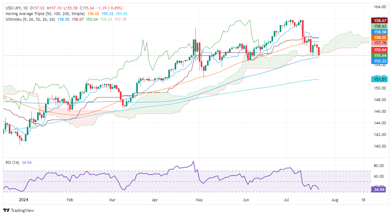 美元/日元价格分析:看跌的RSI表明进一步下跌;支撑位在155.00、154.55、151.86