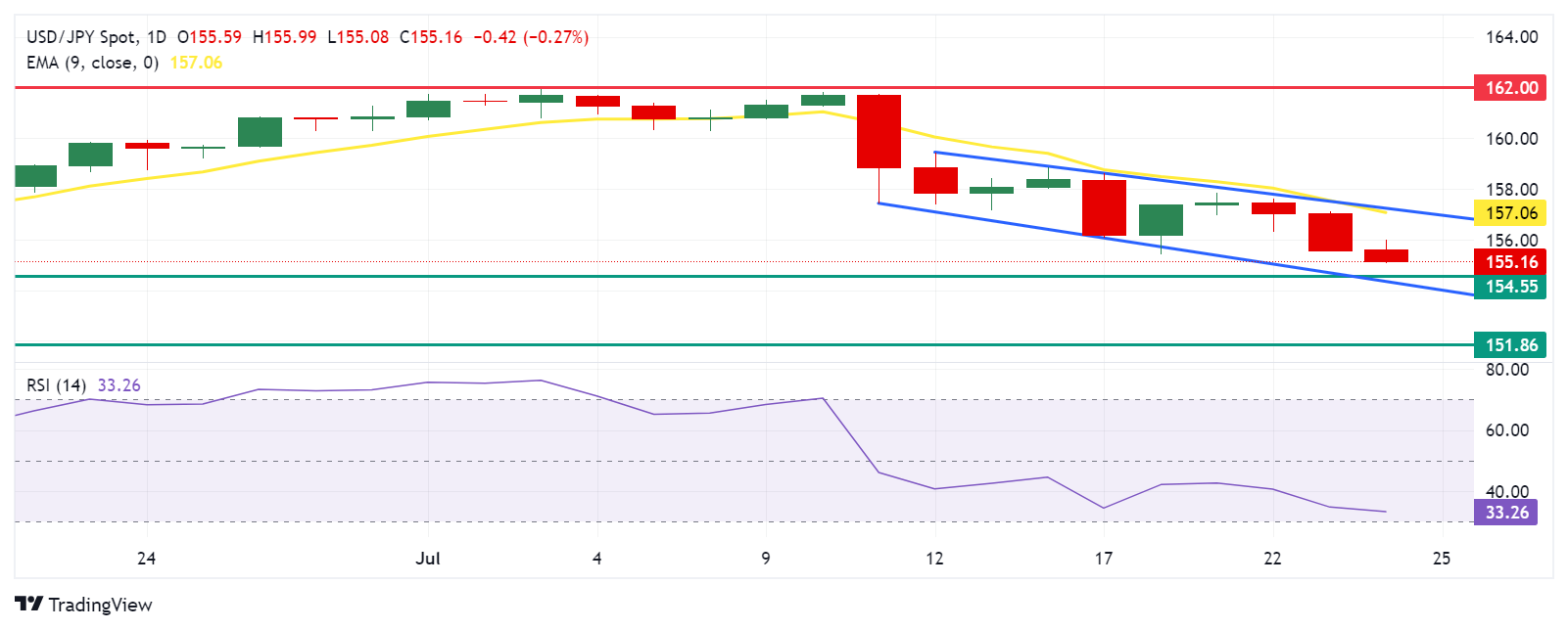 美元/日元可能在6月低点154.55附近找到显著支撑,随后是上升通道的下限。如果跌破这一水平,可能会进一步跌至5月份的低点151.86。