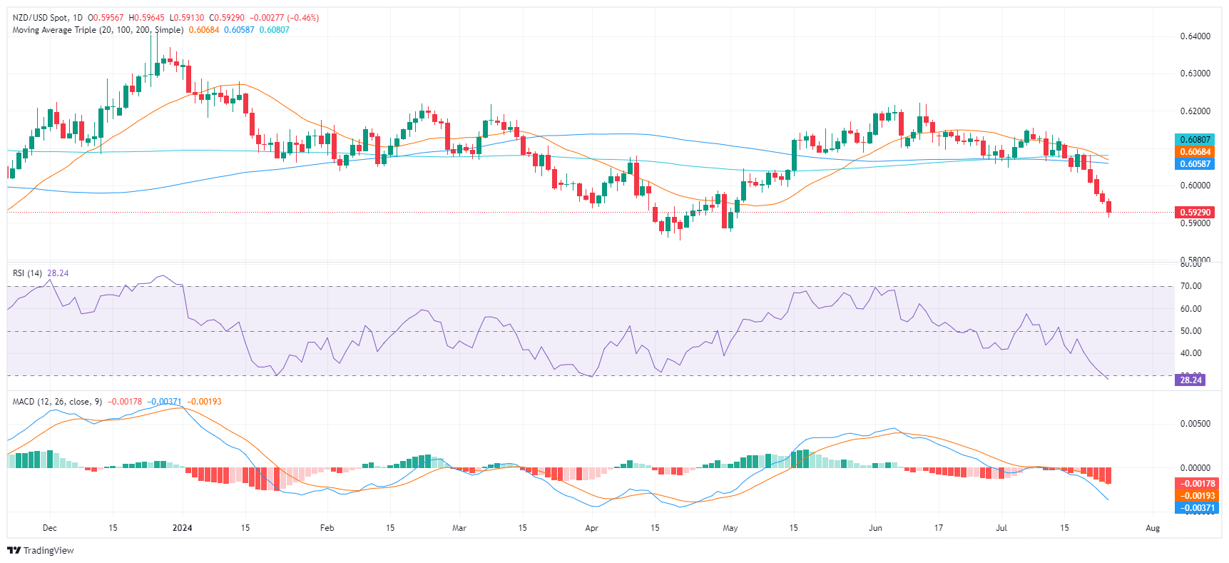 在周三的交易中,新西兰元/美元延续了下跌轨迹,下跌0.55%,稳定在0.5925左右。熊市的持续推进导致汇价进一步跌破0.5900,在早盘暴跌至0.5880左右的5月低点。这确立了围绕货币对的坚定看跌情绪,五天的下跌趋势突显了这一趋势。