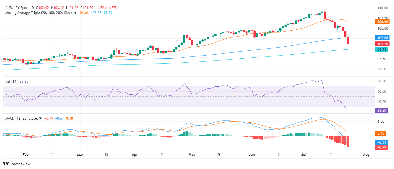 澳元/日元价格分析:在连续四天的暴跌中跌至新低,支撑位在101.00左右