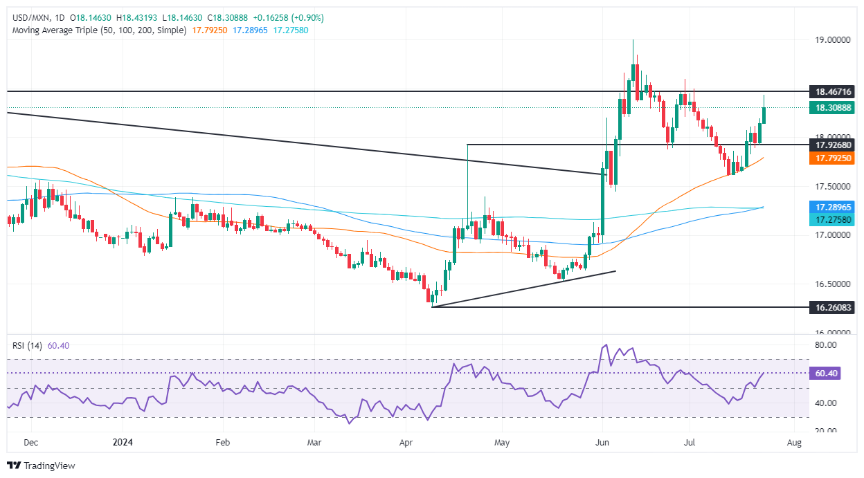 美元/墨西哥比索价格分析:墨西哥比索贬值,美元/墨西哥比索升至18.30以上,