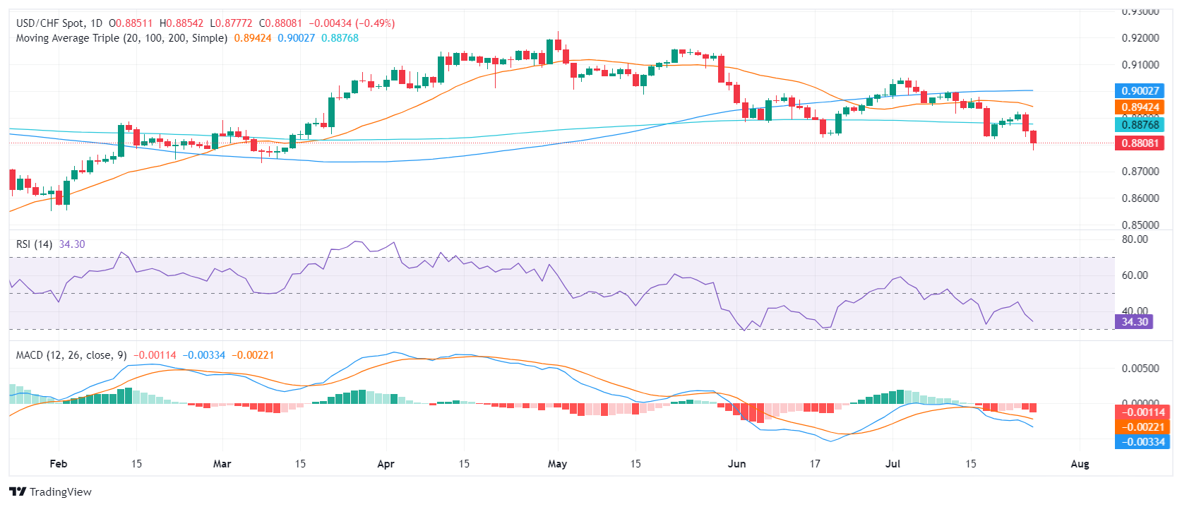 在周四的交易时段,尽管美国公布了强劲的GDP数据,但美元/瑞士法郎继续下跌,收于0.8800左右,跌幅为0.48%。这导致该货币对在过去两个交易日的总损失超过2%。
