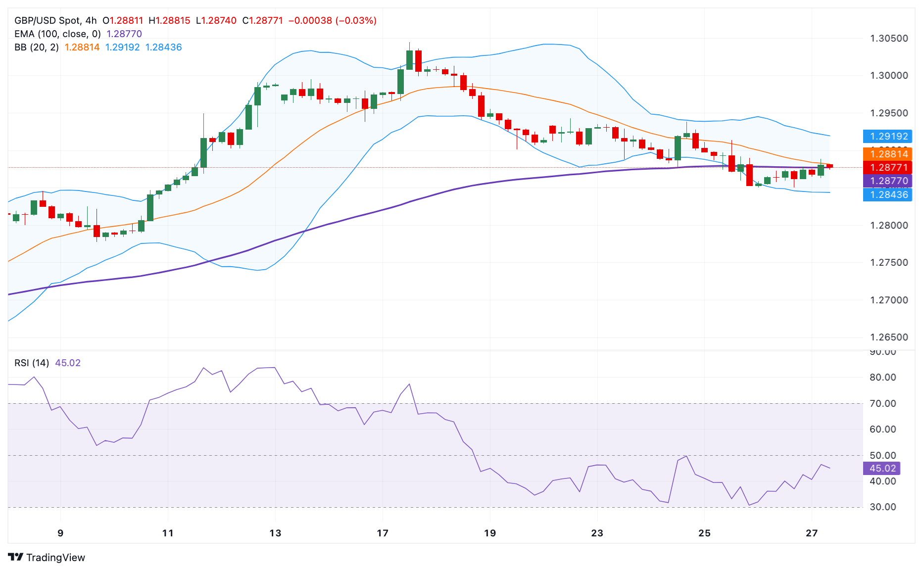 英镑/美元在4小时图上保持看跌前景。与此同时,相对强弱指数(RSI)保持在50中线以下,表明进一步下跌似乎是有利的。然而,一旦主要货币对决定性地越过关键的100期指数移动平均线(EMA),上升趋势将恢复。
