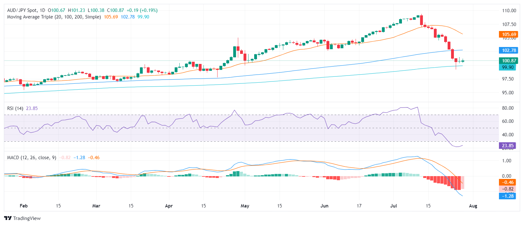 摘要:澳元/日元在周一的交易时段继续稳步上涨,收于100.85,但在几周内仍呈下跌趋势。