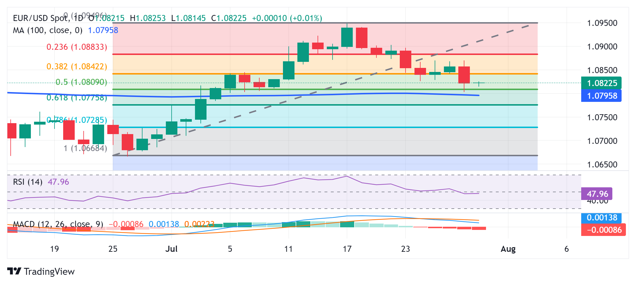 欧元/美元汇率在隔夜从1.0800附近反弹的基础上挣扎,这是一个两周半的低点,在周二的亚洲交易时段在狭窄的范围内波动。现货价格目前在1.0820-1.0825区域附近交易,当天几乎没有变化,因为交易员选择等待欧元区重要的宏观经济数据发布,然后再为坚定的日内走势定位。
