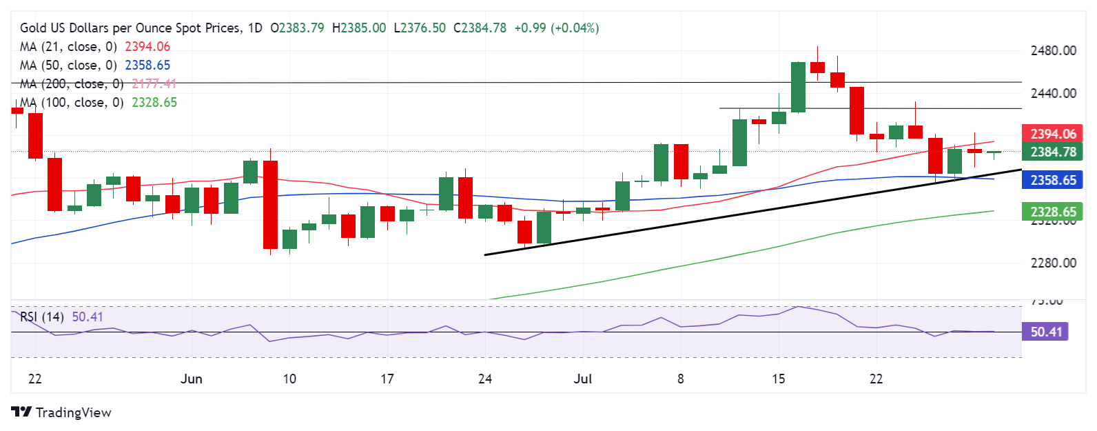 黄金仍然停留在2394美元的21天简单移动平均线(SMA)阻力位和2359美元的50天SMA阻力位之间。上升趋势线与50天SMA重合,使其成为强有力的支撑。