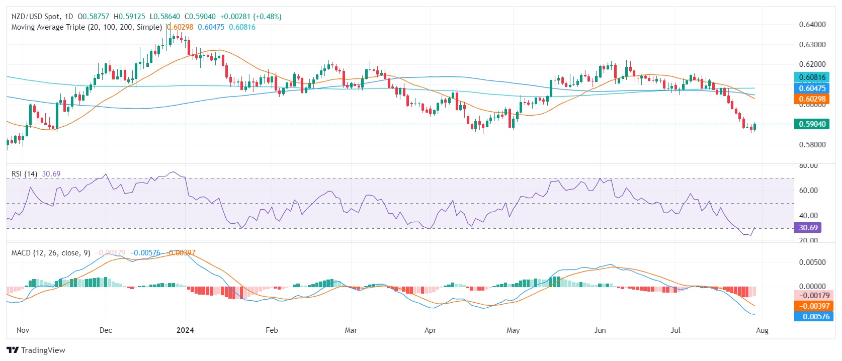 在周二的交易时段,新西兰元/美元对上涨至0.5900,标志着0.40%的小幅回升。这是在7月份看跌之后,该货币对下跌了4%以上。交易员不得不应对一连串的抛售信号,尤其是上周20天简单移动平均线(SMA)在0.6050与100天SMA的看跌交叉。然而,现在的迹象表明,该货币对可能正在进入盘整期。