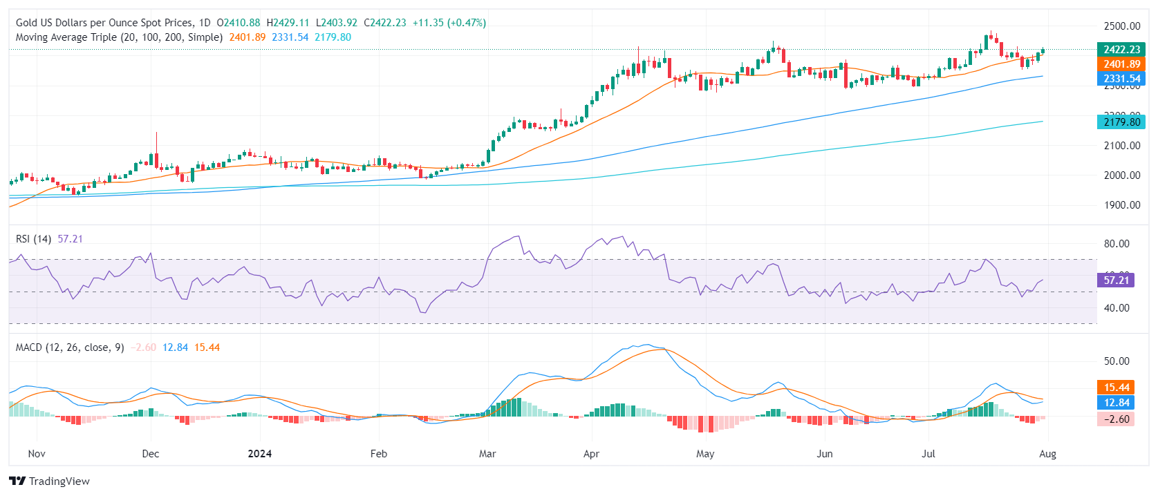 整体前景乐观,价格高于20100和200天简单移动平均线(SMA)。指标也保持积极态势,表明有稳定的购买压力。在接下来的交易日,市场应该关注2400美元至2490美元(周期高点)的波动范围。