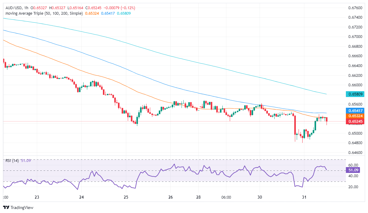 澳元/美元交易波动较大,在美联储发布政策声明后跌至0.6516,但已有所回升,但面临50、100和200小时SMA的关键阻力位,分别为0.6524、0.6532和0.6541。