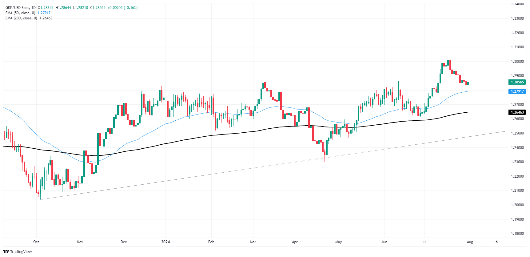 周三,在美联储(Fed)触及市场对7月最后一次加息的广泛预期后,英镑/美元在短期内出现波动,9月美联储降息的预期已完全消化,关键数据尚未公布。英国央行(BoE)预计将自2020年3月以来首次降息,但赔率制定者预计英国央行货币政策委员会(MPC)将以5比4的投票结果进行投票。