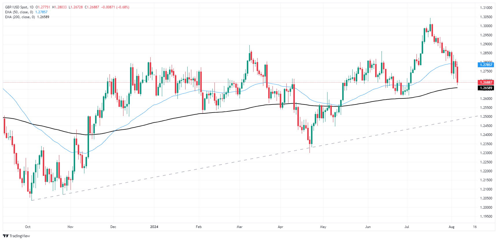 周二,英镑/美元下跌近整整一个百分点,因为英镑对更广泛的外汇市场继续贬值。美元出现疲软,市场因美联储(Fed)9月降息的持续希望而重新转向避险立场,但英镑迅速贬值使Cable跌至1.2700以南的五周新低。