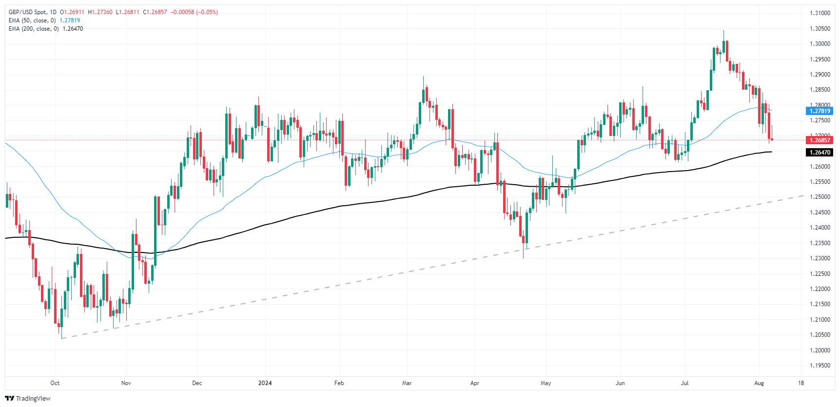 周三,英镑/美元在高位试水,但当天收于1.2700手柄以南。市场正在努力摆脱上周晚些时候开始的广泛下行冲击,此前一系列美国数据低于预期,重新引发了人们对美国即将出现严重衰退的担忧。