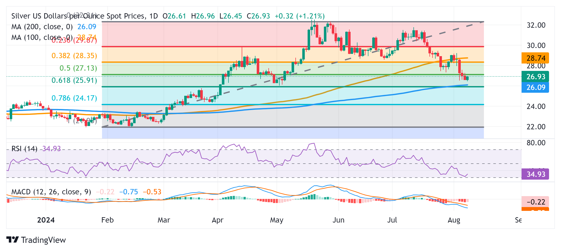 在最近突破100天简单移动平均线(SMA)的背景下,隔夜收盘价低于2月至7月正走势的50%斐波那契回撤水平,这可能被视为看跌交易者的新触发因素。此外,日线图上的技术指标仍处于负值区域,距离超卖区还有一段距离。这反过来证实了负面前景,并表明XAG/USD阻力最小的路径是下行。