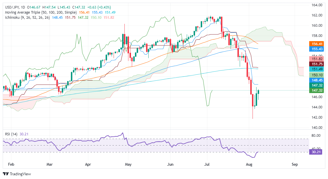 相反,阻力最小的路径是,如果美元/日元跌破147.00,下一个支撑位将是8月8日的低点145.44,随后是8月7日的低点144.28。一旦超过这些水平,下一个支撑位将是8月6日的每日低点143.61,随后是最近的周期低点141.69。