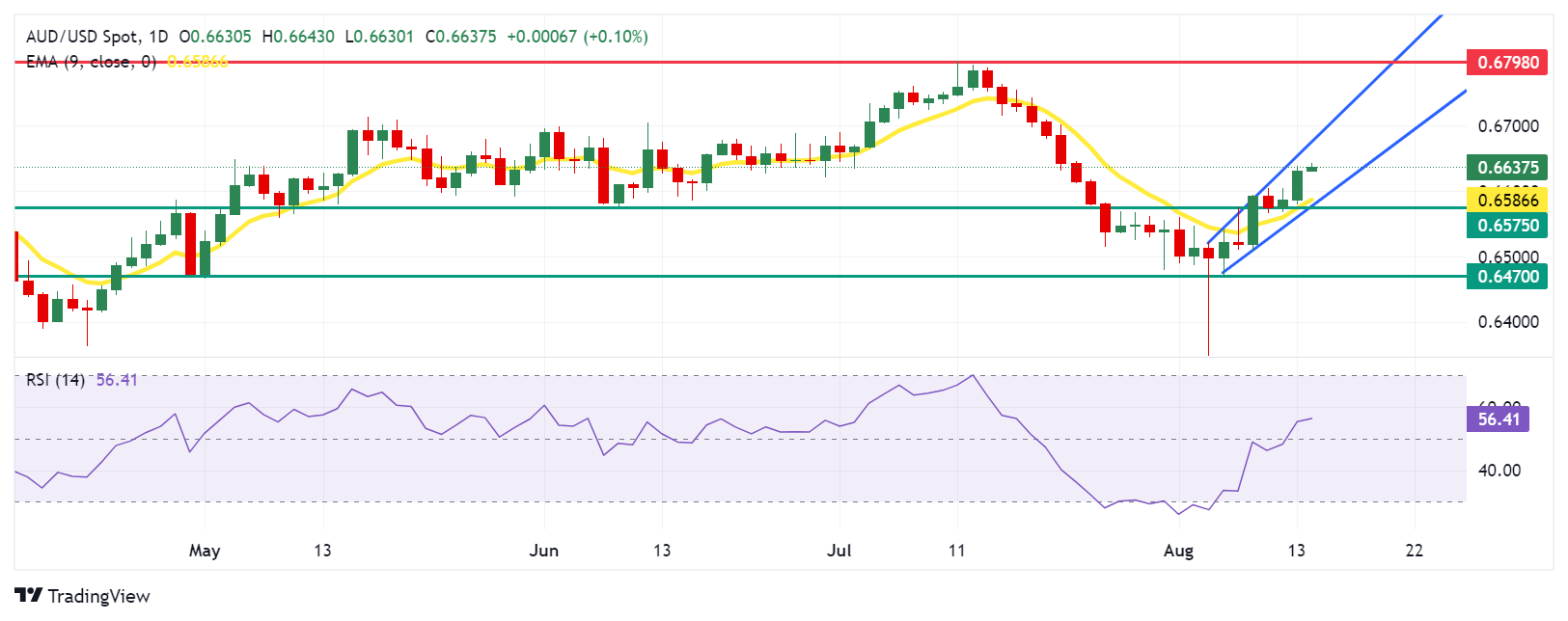 周三,澳元的交易价格约为0.6640。日线图分析表明,澳元/美元对在上升通道内向上移动,表明看涨倾向增强。此外,14天相对强弱指数(RSI)已超过50点,证实了看涨势头。