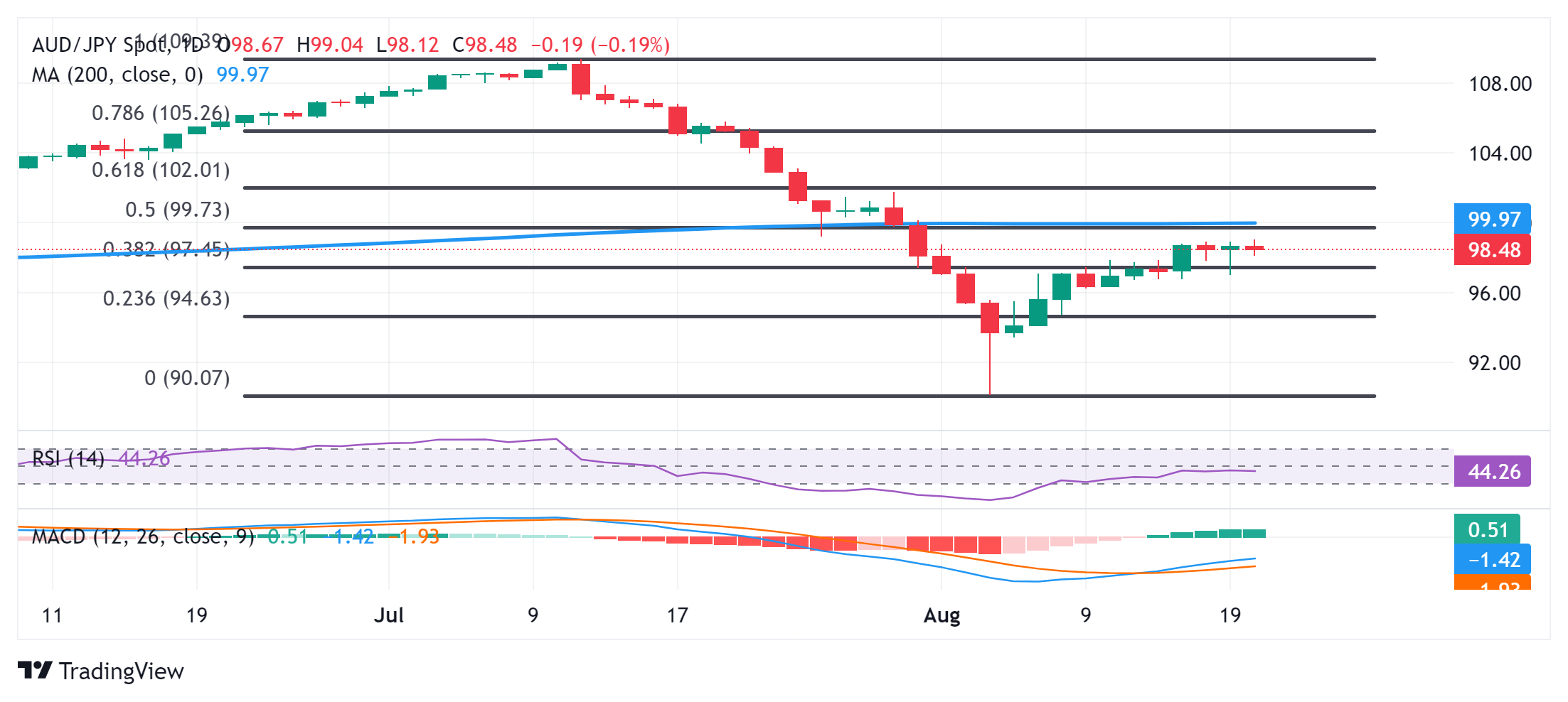 澳元/日元交叉盘在欧洲交易日上半段温和上涨/小幅下跌之间徘徊,现在似乎已经稳定在98点左右,略低于本周二早些时候触及的月度峰值。
