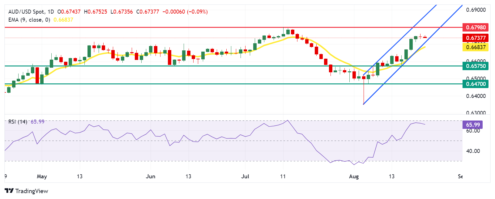 周四,澳元兑美元汇率在0.6740左右。日线图分析显示,澳元/美元在上升通道内盘整,表明存在看涨倾向。此外,14天相对强弱指数(RSI)仍略低于70大关,支撑了持续的看涨势头。进一步的上涨可能表明货币对超买,可能导致回调。