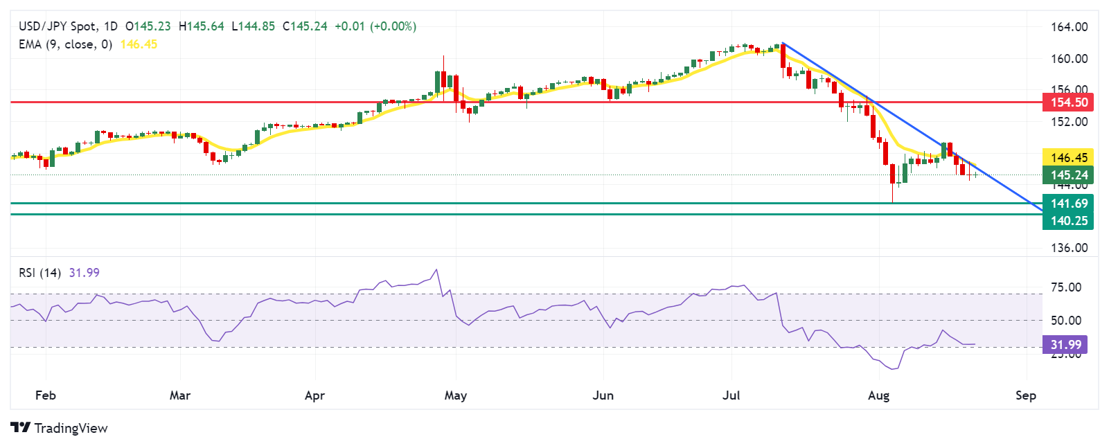 周四,美元/日元的交易价格约为145.20。日线图分析显示,该货币对正在下行趋势线下盘整,表明存在看跌倾向。此外,14天相对强弱指数(RSI)略高于30,表明该货币对可能出现回调。