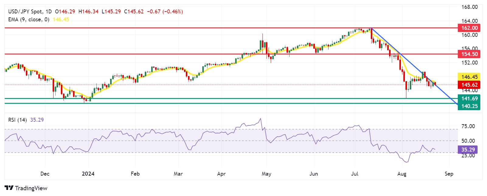 周五,美元/日元的交易价格约为145.60。日线图分析显示,该货币对位于下降趋势线之上,表明看跌倾向减弱。然而,14天相对强弱指数(RSI)仍略高于30,表明看跌趋势可能仍在发挥作用。