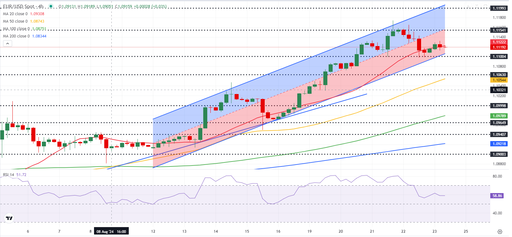 在连续四个交易日上涨并在反弹中上涨超过1.5%后,欧元/美元周四在美国时段进行了调整,并在负区间收盘。周五欧洲时段,该货币对稳定在1.1100上方,因为投资者在等待美联储主席杰罗姆·鲍威尔在杰克逊霍尔研讨会上发表开幕词时持观望态度。