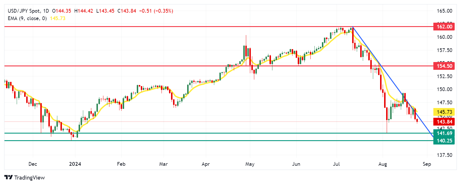 周五,美元/日元的交易价格约为143.90。日线图分析显示,该货币对位于下降趋势线以下,表明存在看跌倾向。然而,14天相对强弱指数(RSI)仍略高于30,表明看跌趋势可能会继续。