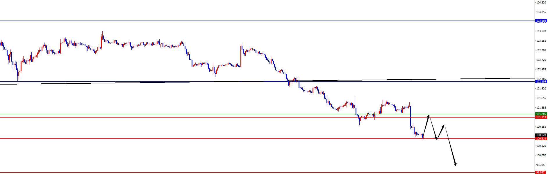 美指101.10-20区间空,防守40点,目标100.50-99.60