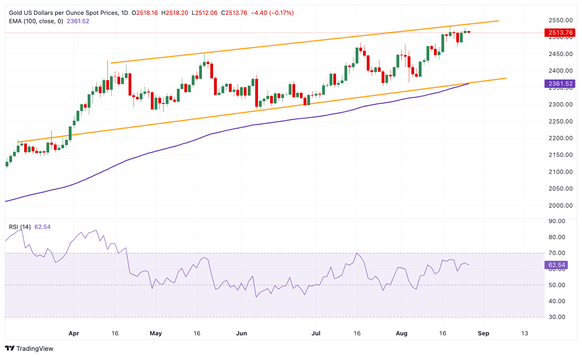 周二,美元(USD)温和复苏,金价(XAU/USD)处于负值区间。尽管如此,美联储主席杰罗姆·鲍威尔在杰克逊霍尔发出的开始降息的信号可能会支持贵金属。较低的利率通常对黄金有利,因为它们降低了持有无息资产的机会成本。此外,中东地缘政治紧张局势的加剧可能会进一步提振黄金这一传统安全资产。