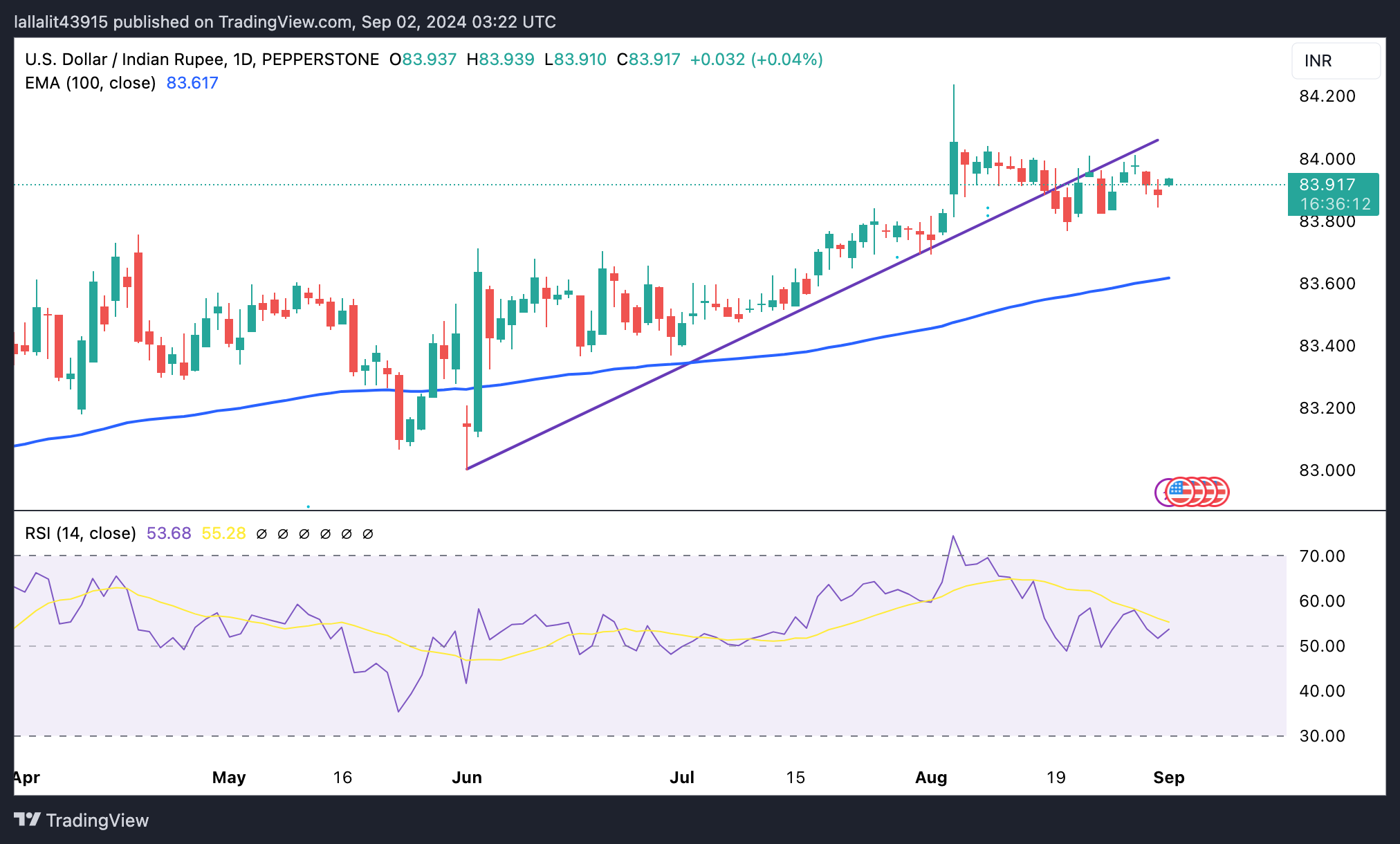印度卢比当天交易价格较低。美元/印度卢比仍在84.00关口以下。然而,美元/印度卢比的积极观点仍然存在,因为该货币对在日线图上的关键100天指数移动平均线(EMA)上方得到了很好的支撑。14天相对强弱指数(RSI)保持在54.50附近的看涨区域,表明整体势头强烈有利于看涨者。