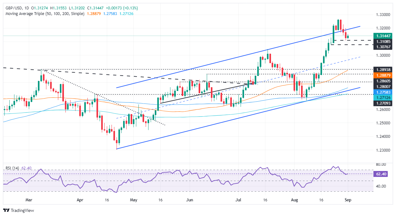 摘要:英镑/美元未能保持在7月高点1.3142上方,8月收于1.3122,暗示可能出现盘整。