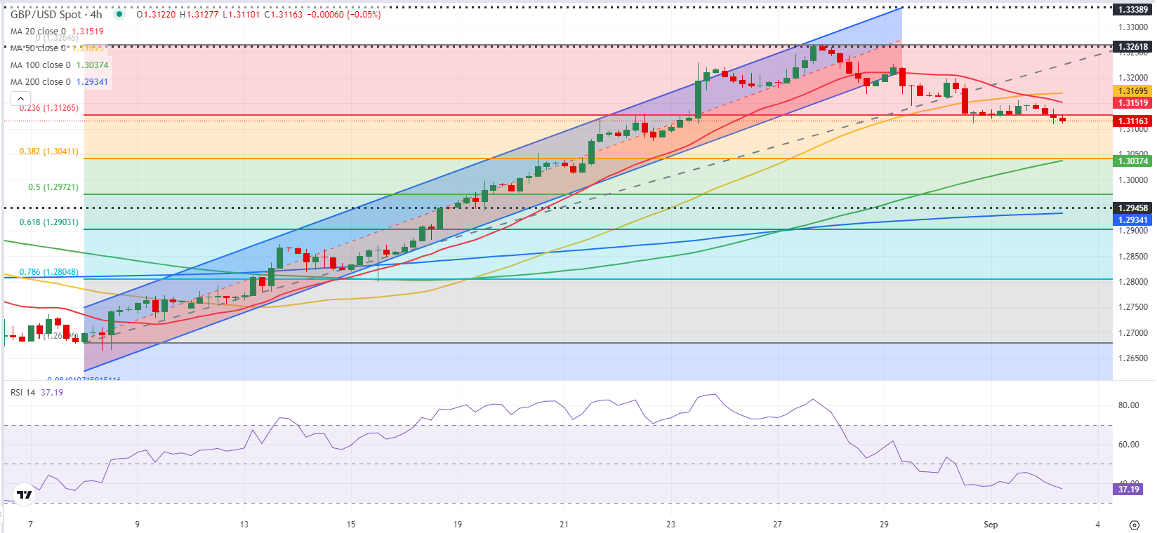 英镑/美元在本周第一天接近1.3130(最新上涨趋势的斐波那契23.6%回撤位)后跌破1.3130。与此同时,4小时图上的相对强弱指数(RSI)指标回落至40以下,表明卖方仍控制着该货币对的走势。